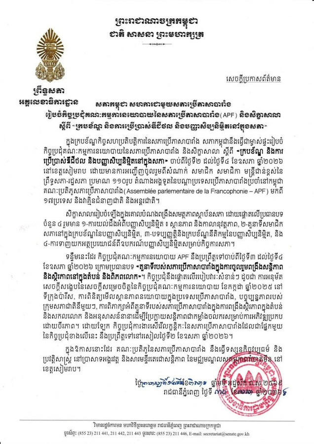 بنوم بنه - ٢٨ نيسان/أبريل ٢٠٢٦م، وكالة الأنباء الكمبودية استقبلت، معالي النائبة الدائمة لوزير الخارجية والتعاون الدولي السيدة إيت صوفيا، في مقر الوزارة، سعادة سفير نيوزيلندا لدى مملكة كمبوديا السيد جوناثان كينغز، وذلك في زيارة وداعية بمناسبة انتهاء مهامه الدبلوماسية في المملكة. وخلال اللقاء، أعربت معاليها عن بالغ تقديرها للجهود الفاعلة التي ب...