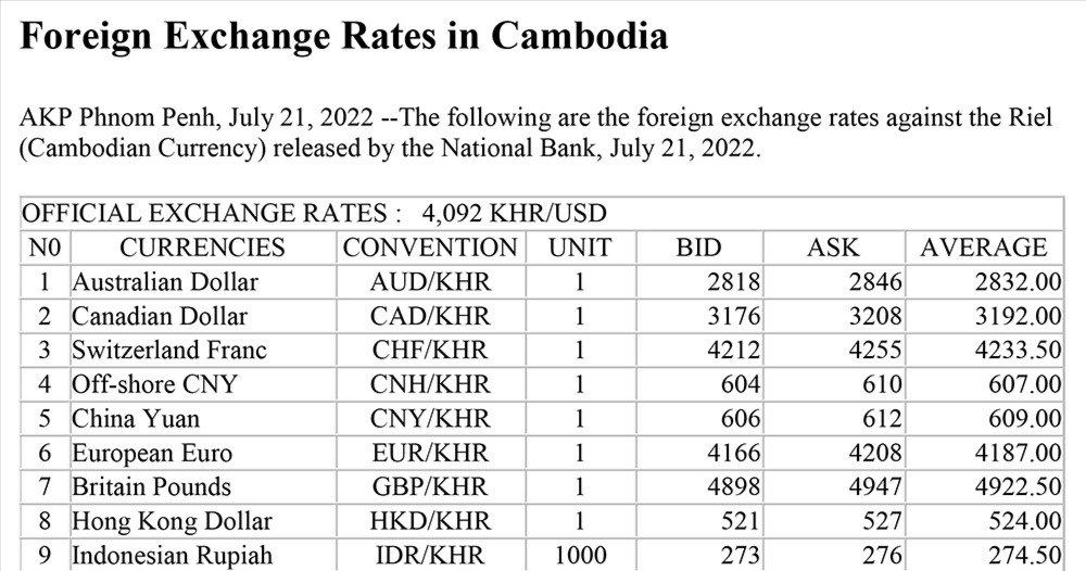 اسعار العملات اليوم في كمبوديا بالريال الكمبودي الصادرة عن بنك كمبوديا الوطني في ٢١ تموز/يوليو ٢٠٢٢ كالتالي:
