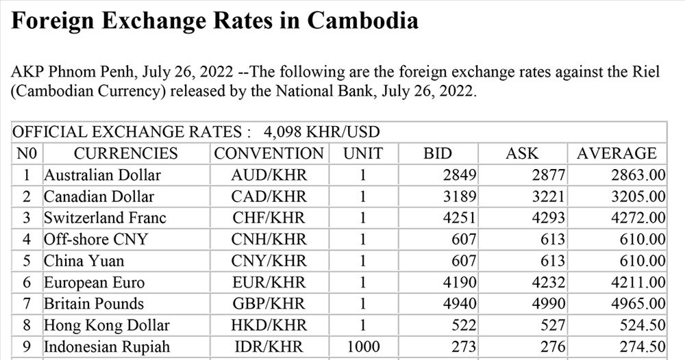 اسعار العملات اليوم في كمبوديا بالريال الكمبودي الصادرة عن بنك كمبوديا الوطني في ٢٦ تموز/يوليو ٢٠٢٢ كالتالي: