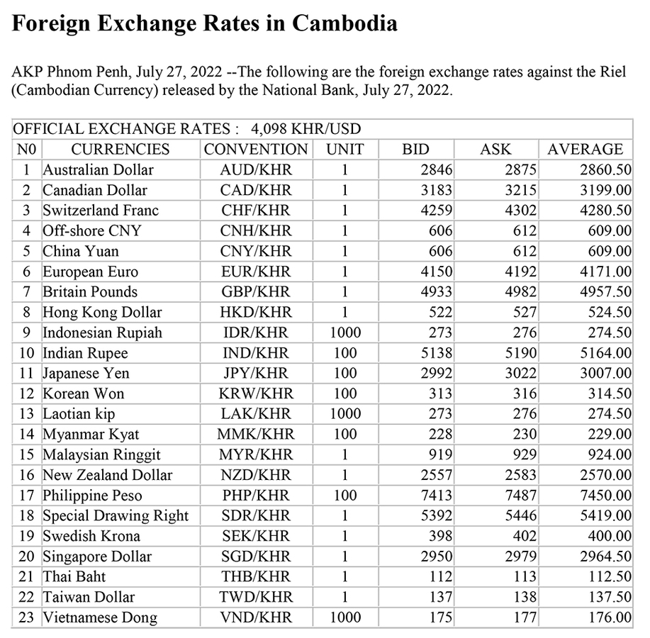 بنوم بنه- في ٢٧ تموز/يوليو ٢٠٢٢، وكالة الأنباء الكمبودية. اسعار العملات اليوم في كمبوديا بالريال الكمبودي الصادرة عن بنك كمبوديا الوطني في ٢٦ تموز/يوليو ٢٠٢٢ كالتالي: