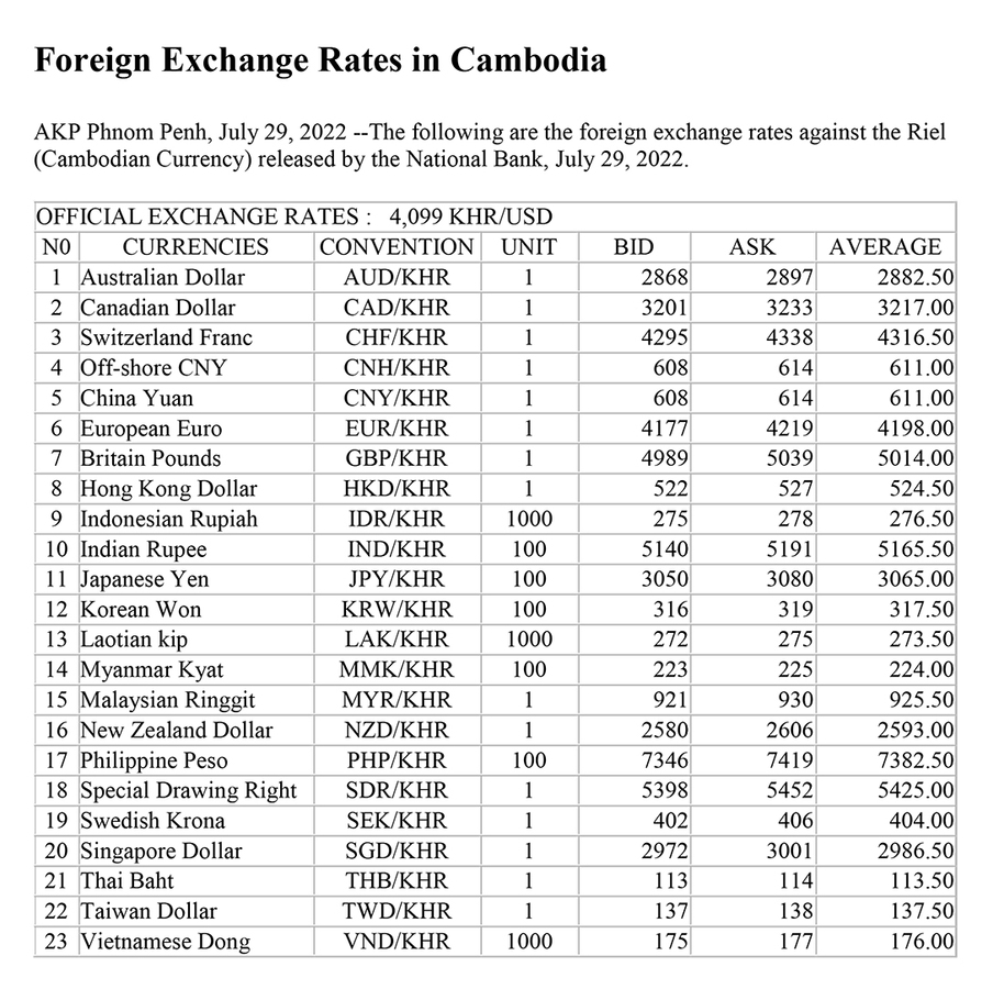 بنوم بنه- في ٢٩ تموز/يوليو ٢٠٢٢، وكالة الأنباء الكمبودية. اسعار العملات اليوم في كمبوديا بالريال الكمبودي الصادرة عن بنك كمبوديا الوطني في ٢٩ تموز/يوليو ٢٠٢٢ كالتالي: