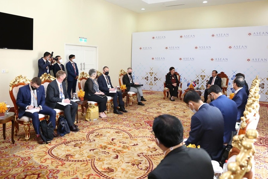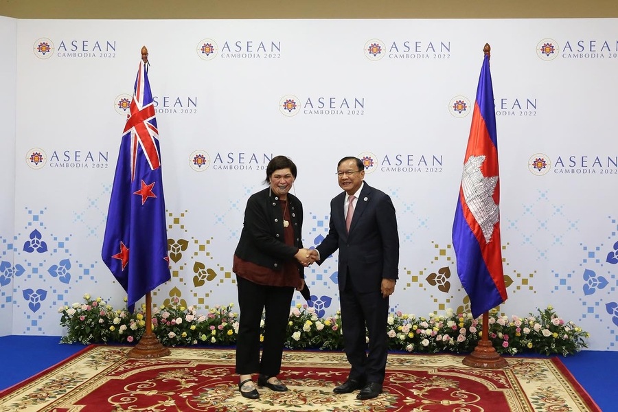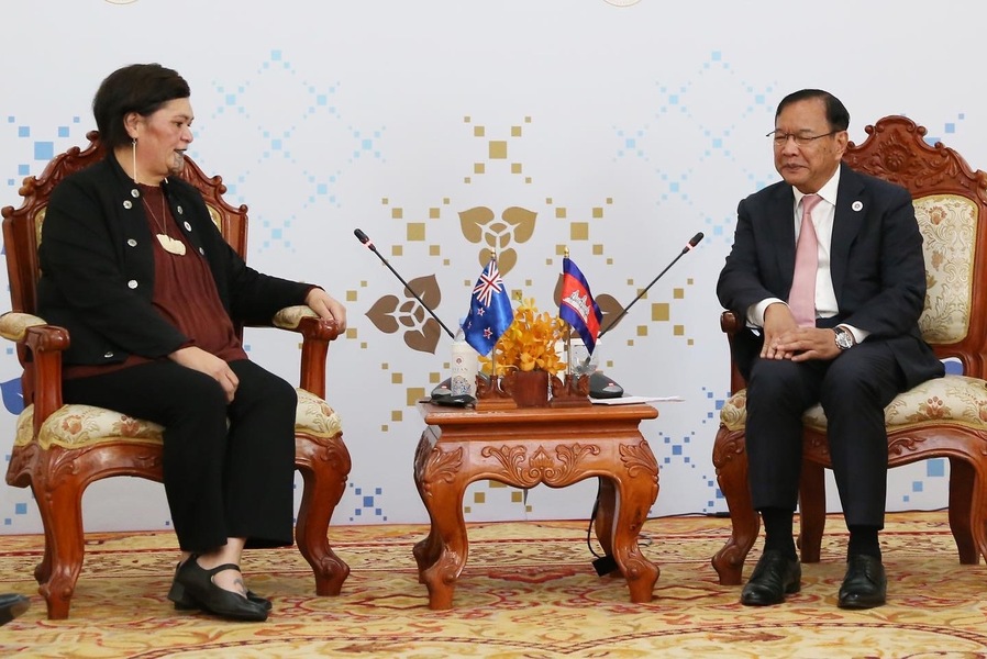 معالي براك سوخون، نائب رئيس الوزراء، وزير الخارجية والتعاون الدولي لمملكة كمبوديا معالي نانايا ماهوتا، وزيرة خارجية نيوزلاندا، أثناء إقامتها في كمبوديا لحضور الاجتماع الخامس والخمسين لوزراء خارجية رابطة أمم جنوب شرق آسيا والاجتماعات ذات الصلة في عاصمة بنوم بنه.