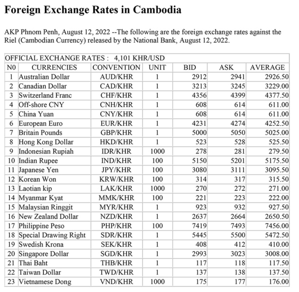 بنوم بنه- في ١٢ آب/أغسطس ٢٠٢٢، وكالة الأنباء الكمبودية. اسعار العملات اليوم في كمبوديا بالريال الكمبودي الصادرة عن بنك كمبوديا الوطني في ١٢ آب/أغسطس ٢٠٢٢ كالتالي:
