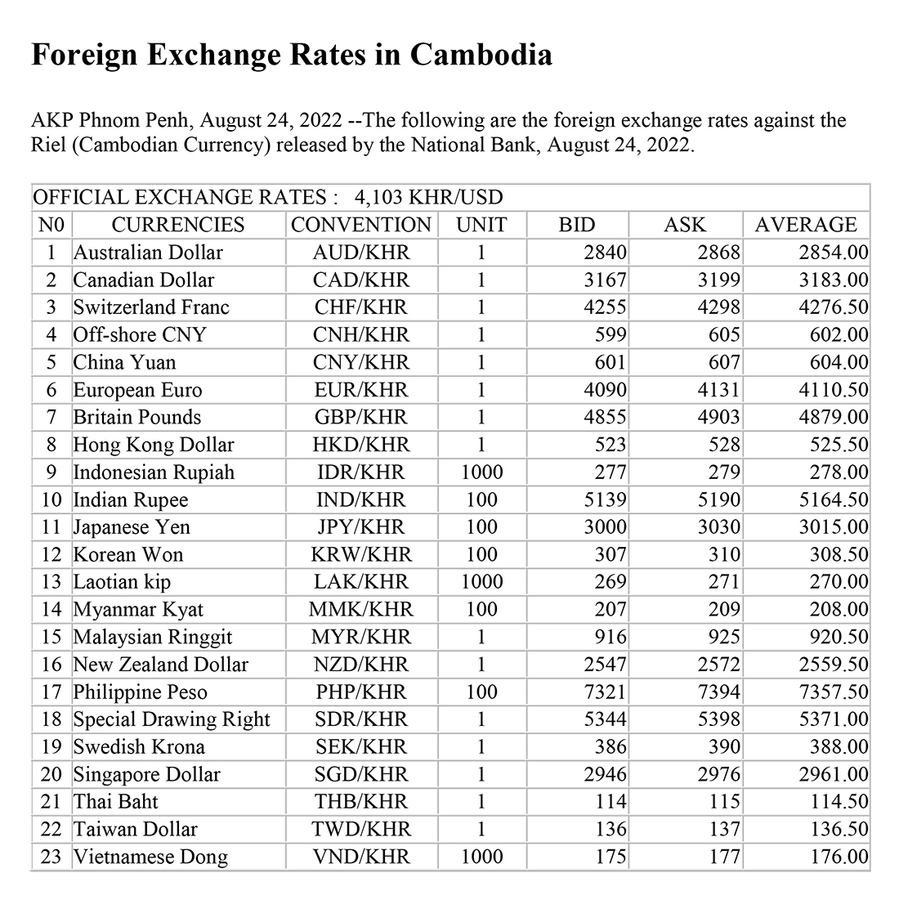نوم بنه- في ٢٤ آب/أغسطس ٢٠٢٢، وكالة الأنباء الكمبودية. اسعار العملات اليوم في كمبوديا بالريال الكمبودي الصادرة عن بنك كمبوديا الوطني في ٢٤ آب/أغسطس ٢٠٢٢ كالتالي: