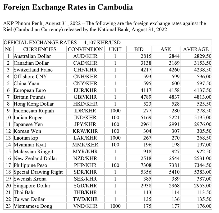 نوم بنه- في ٣١ آب/أغسطس ٢٠٢٢، وكالة الأنباء الكمبودية. اسعار العملات اليوم في كمبوديا بالريال الكمبودي الصادرة عن بنك كمبوديا الوطني في ٣١ آب/أغسطس ٢٠٢٢ كالتالي: