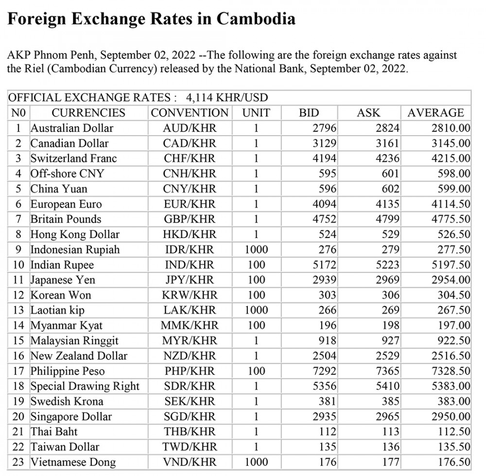نوم بنه- في ٢ أيلول/سبتمبر ٢٠٢٢، وكالة الأنباء الكمبودية. اسعار العملات اليوم في كمبوديا بالريال الكمبودي الصادرة عن بنك كمبوديا الوطني في٢ أيلول/سبتمبر ٢٠٢٢ كالتالي: