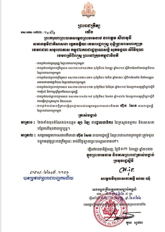 أصدر القائم بأعمال رئيس الدولة، سامديتش فيبول سينا فيكيدي ساي تشوم، مرسومًا ملكيًا بتعيين السيد لا لاي، القائد السابق لقوات الدرك الإقليمية في تاكيو، نائب الوزير بوزارة العبادات والشؤون الدينية.