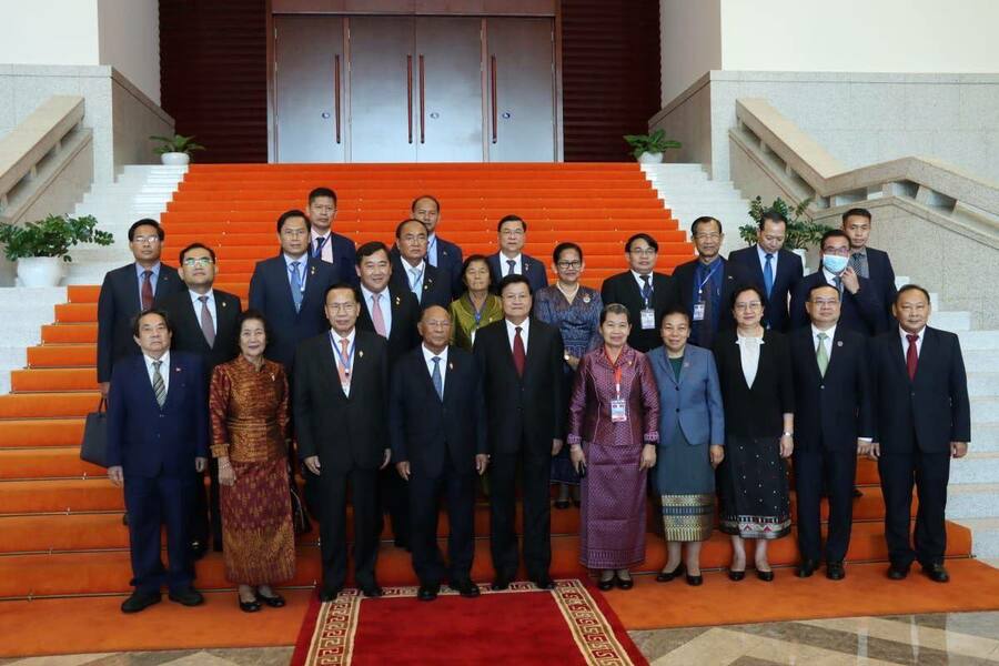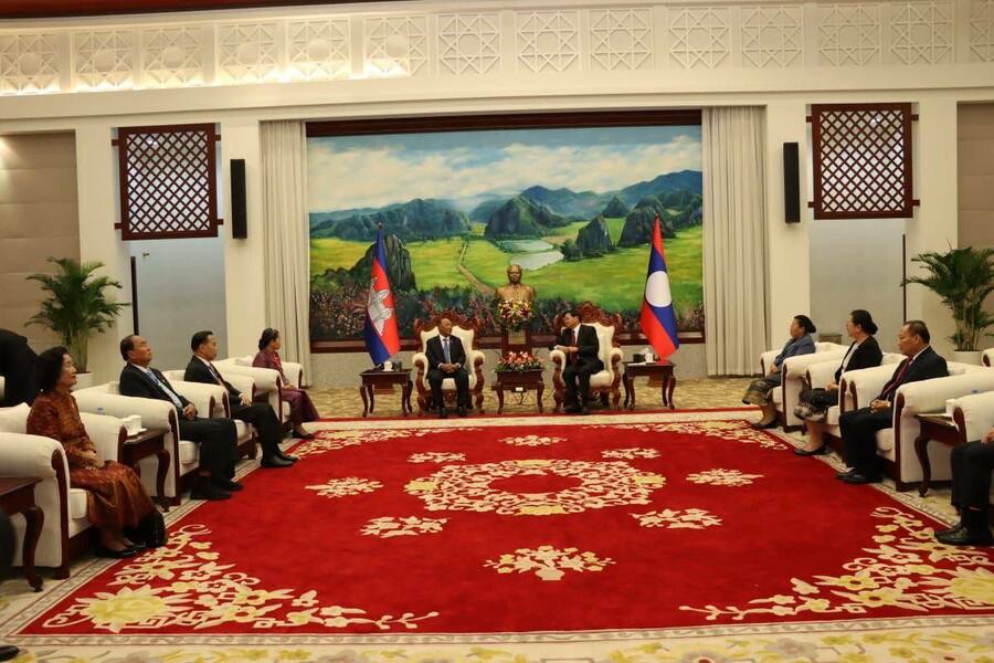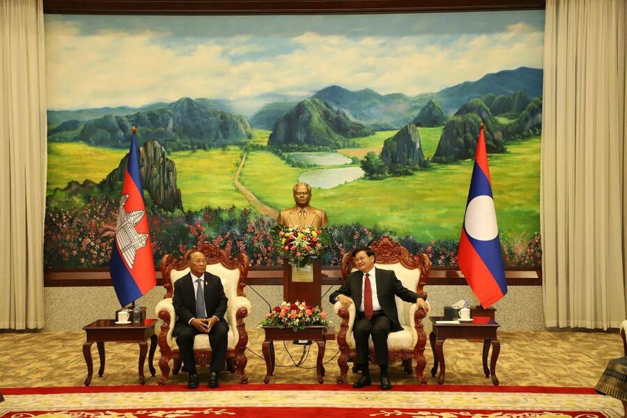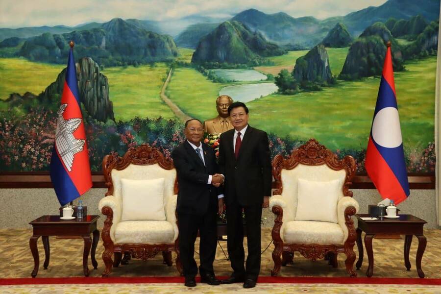 سامديتش أكا موها بونيا تشاكري هينغ سامرين، رئيس الجمعية الوطنية لمملكة كمبوديا يصافح معالي الدكتور ثونجلون سيسوليث، رئيس جمهورية لاو الديمقراطية الشعبية، قبل اجتماعهم الترحيبي في فينتيان، لاوس، بعد ظهر يوم ١٤ سبتمبر.