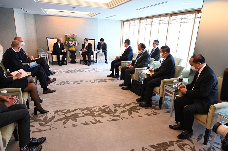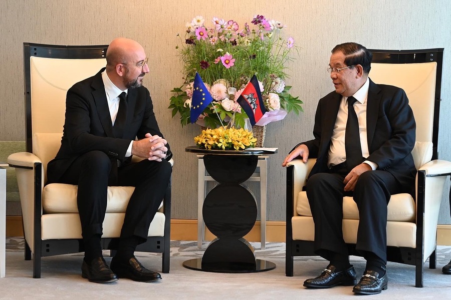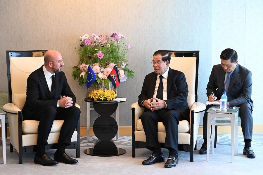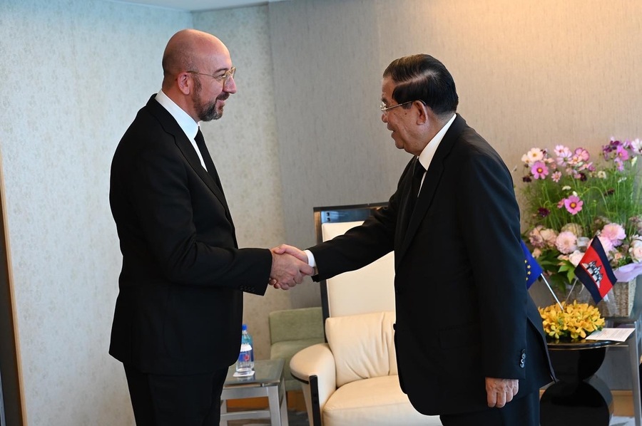 استقبل سامديتش أكا موها سينا بادي تيتشو هون سين، رئيس وزراء مملكة كمبوديا فخامة تشارلز ميشيل، رئيس المجلس الأوروبي، في طوكيو هذا الصباح اليوم ٢٧ أيلول/سبتمبر ٢٠٢٢، خلال إقامتهما في اليابان لحضور الجنازة الرسمية لرئيس الوزراء الياباني السابق معالي آبي شينزو.