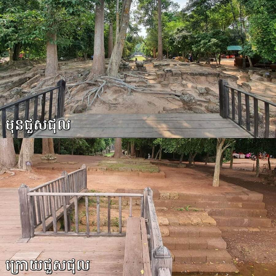 قال السيد تشيا ساريث، عالم الآثار رئيس مشروع ترميم الشرفة هذا، إن المشروع انقسم إلى مرحلتين، مع بدء المرحلة الأولى في يناير ٢٠٢٢، ويتم الانتهاء منها الآن. وأضاف أن هذه الشرفة تضررت وفقدت الكثير من الحجارة بسبب عصر البناء وجذور الأشجار وتآكل التربة، مما أدى إلى انهيار هيكل الشرفة في الماء وما إلى ذلك. قبل عملية الترميم، قام الفريق بالتنقيب والعثور على بعض الحجارة وإعادتها إلى مكانها الأصلي.