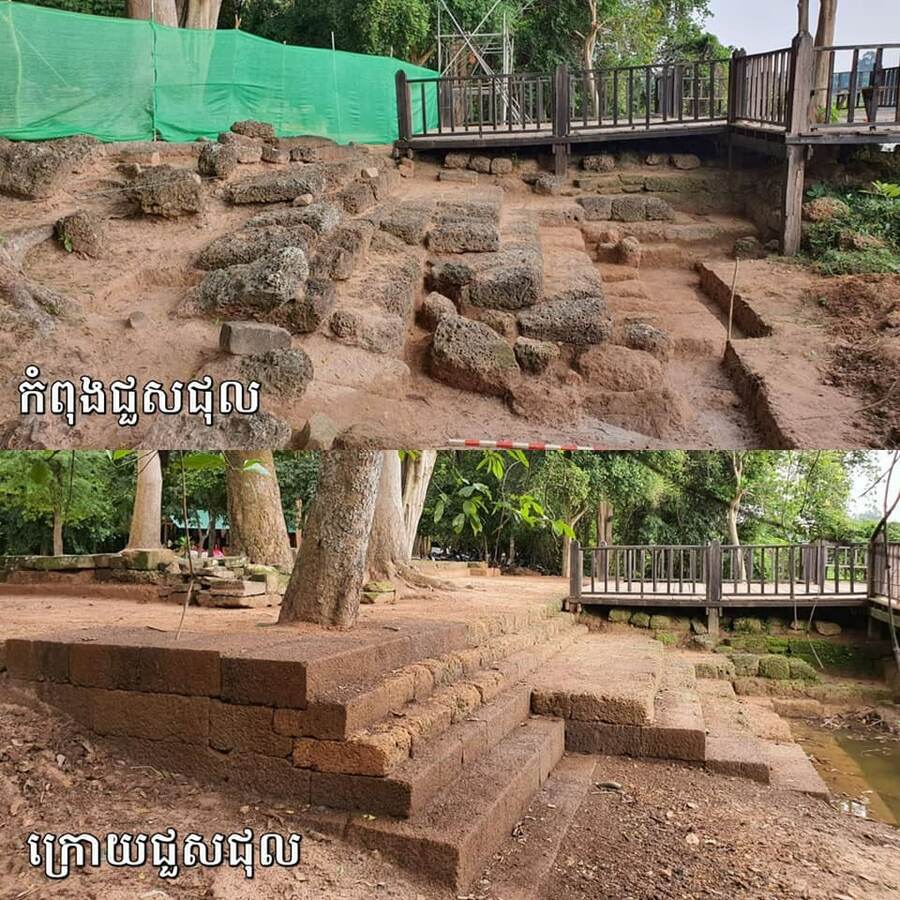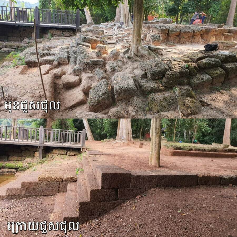 قال السيد تشيا ساريث، عالم الآثار رئيس مشروع ترميم الشرفة هذا، إن المشروع انقسم إلى مرحلتين، مع بدء المرحلة الأولى في يناير ٢٠٢٢، ويتم الانتهاء منها الآن. وأضاف أن هذه الشرفة تضررت وفقدت الكثير من الحجارة بسبب عصر البناء وجذور الأشجار وتآكل التربة، مما أدى إلى انهيار هيكل الشرفة في الماء وما إلى ذلك. قبل عملية الترميم، قام الفريق بالتنقيب والعثور على بعض الحجارة وإعادتها إلى مكانها الأصلي.